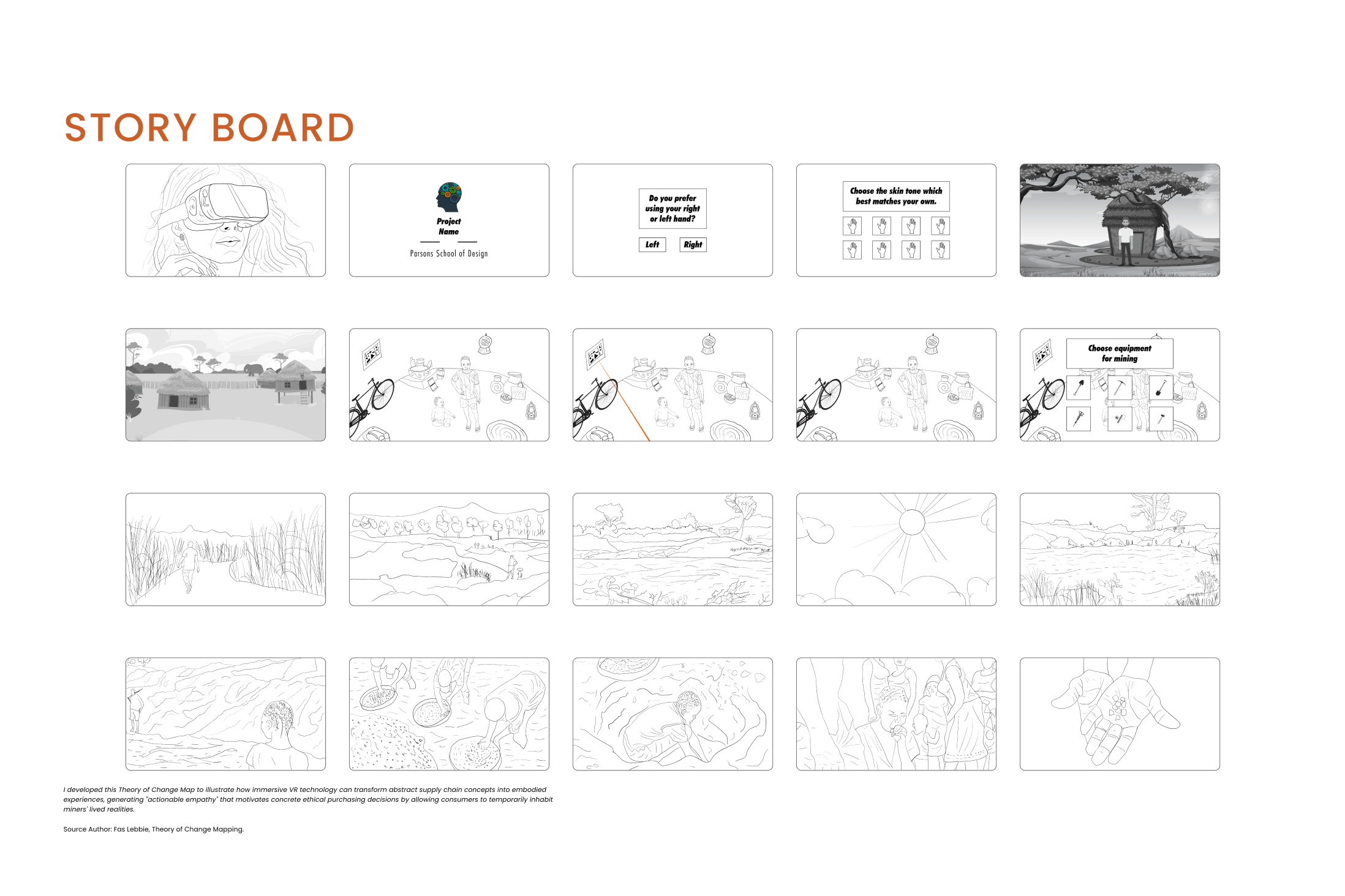 My design philosophy centers on creating an embodied understanding of the problem space. I leveraged VR’s unique power to generate what Philippe Bertrand et al. calls “actionable empathy”, a perceptual illusion of embodiment that allows users to temporarily experience another’s reality. Bertrand identified this feeling as key for designers because it challenges people’s consciences and biases by placing them in someone else’s experience. By integrating field research from the Kono District with iterative design methodologies, I created an experience that transforms abstract supply chain concepts into visceral encounters. This approach recognizes that true behavioral change requires more than information; it demands genuine connection. Through VR, users temporarily live through miners’ challenges, generating tangible solidarity that motivates action. The methodology balanced authentic representation with emotional engagement, ensuring the experience honors miners’ realities while creating meaningful connections that inspire change.